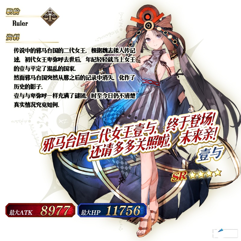 ※只能在限时活动「非同寻常茶道之战 唠唠叨叨新邪马台国 从地狱归来的男人」的活动道具交换期间内获得「★4(SR)壹与」的灵衣开放权。