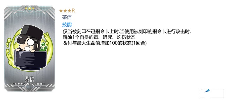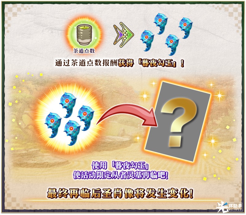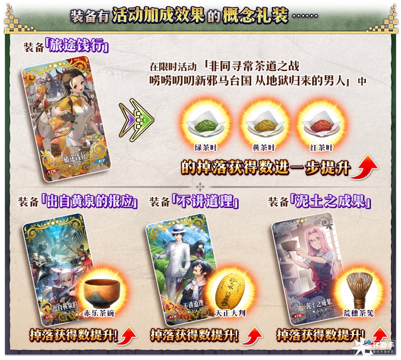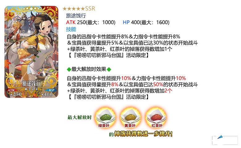装备茶道点数报酬和活动道具交换中可获得的活动限定概念礼装「★5(SSR)旅途饯行」,在限时活动「非同寻常茶道之战 唠唠叨叨新邪马台国 从地狱归来的男人」中「绿茶叶」「黄茶叶」「红茶叶」的掉落获得数将提升!