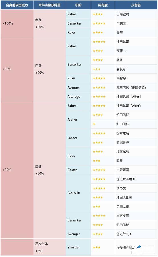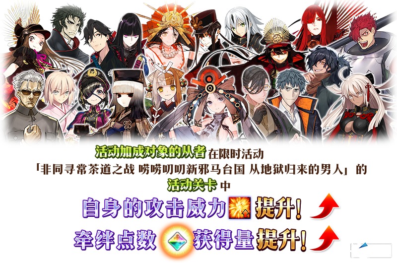 本次活动期间内,下表中的从者将在活动关卡中被付与「自身的攻击威力提升」以及「牵绊点数获得量提升」的效果!