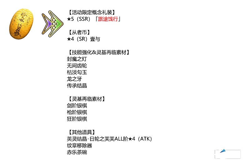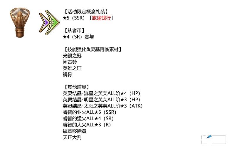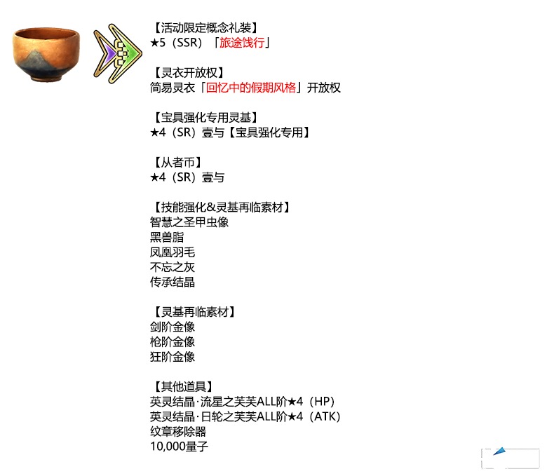 ※简易灵衣「回忆中的假期风格」开放权、传承结晶、英灵结晶・流星之芙芙ALL阶★4(HP)、英灵结晶・日轮之芙芙ALL阶★4(ATK)将在通关本活动的主线关卡闲话后方可交换。