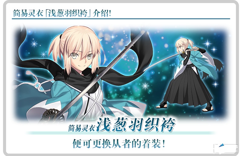 达·芬奇工房的「灵衣缝制」中可以交换的「★5(SSR)冲田总司(Saber)」的简易灵衣「浅葱羽织袴」开放权,在通关「终局特异点」后即可免费交换!