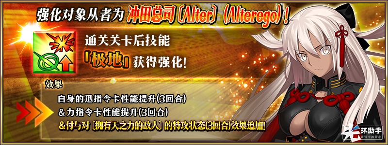 ※只能在限时活动「非同寻常茶道之战 唠唠叨叨新邪马台国 从地狱归来的男人」的活动道具交换期间内获得「★5(SSR)冲田总司〔Alter〕(Alterego)」的灵衣开放权。