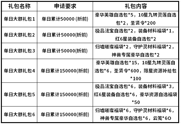 【活动内容】:单日累计充值金额达到50000和150000元(折扣前),即实际充值500和1500元,即可从下方礼包内选择1个大额礼包作为单日大额奖励