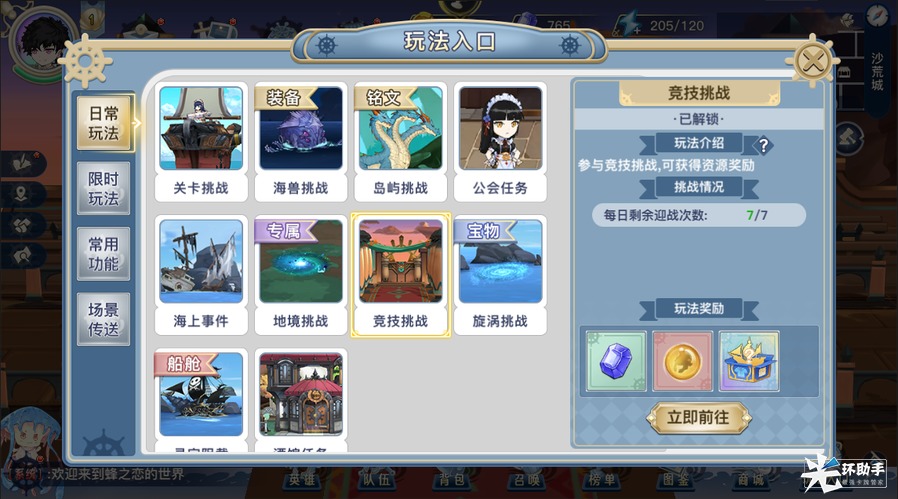 【玩法入口】界面中,点击【竞技挑战】按钮可以显示挑战详情,系统每天05:00会重置免费的竞技场迎战次数,点击【立即前往】按钮可直接传送到竞技场场景中,点击【上场】图标按钮,就可以参加竞技场挑战了。