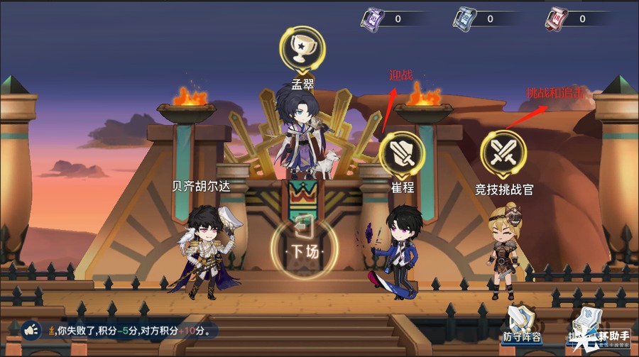 1、迎战:系统会随机1名玩家,挑战无论胜负都会消耗1次迎战次数,进攻胜利可获得10分,若进攻失败则扣除5分