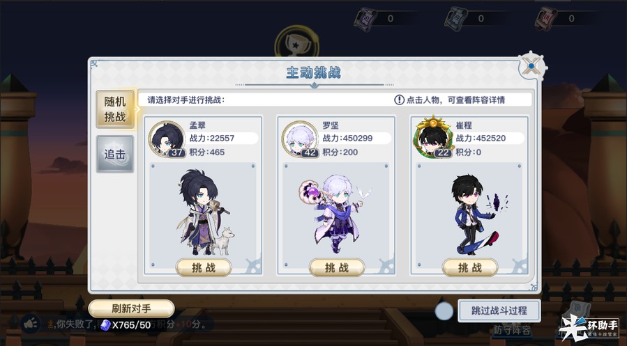 2、挑战:系统每次会随机3名玩家,可选任意一名玩家进行挑战,每次消耗1张【挑战卷】,进攻胜利可获得10分,若进攻失败则扣除5分