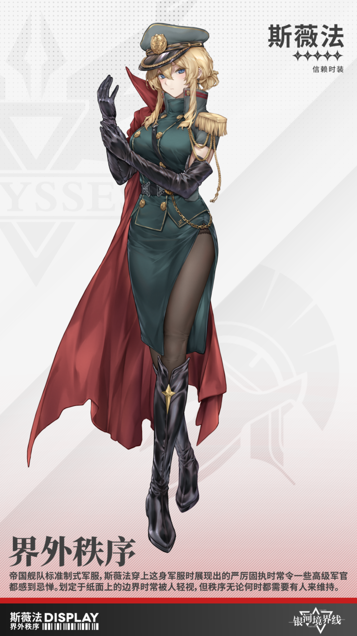 帝国舰队标准制式军服,斯薇法穿上这身军服时展现出的严厉固执时常令一些高级军官都感到忌惮。划定于纸面上的边界时常被人轻视,但秩序无论何时都需要有人来维持。