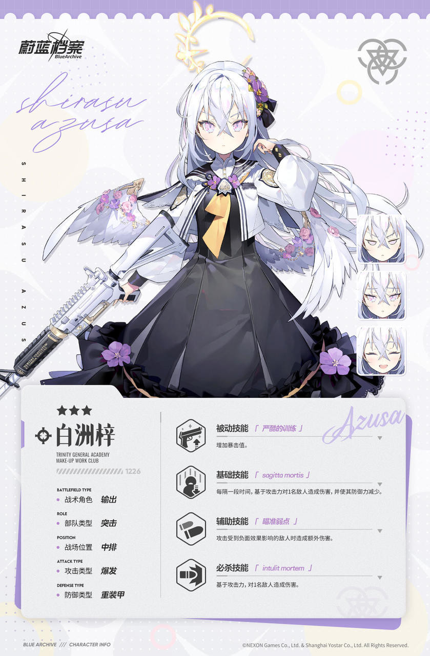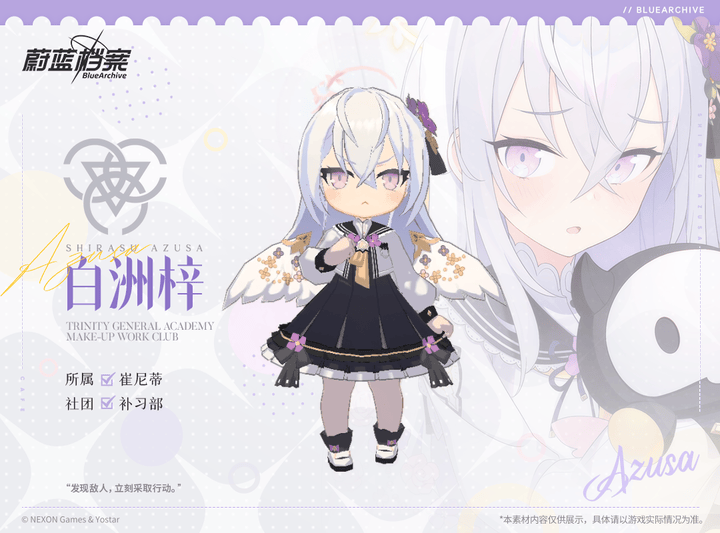 《蔚蓝档案》【新增人物档案】白洲梓蔚蓝档案发布于 2023-09-24//////////档案启封////////// ■白洲梓崔尼蒂补习部的冰冷魔女。主动离开了曾经的学院,又因某种原因加入了崔尼蒂,目前正在努力习惯新的生活。害怕孤独,却因为不想给人添麻烦而主动远离所有人。这让补习部的成员们很是担心。“嗯。这样我就能回应老师的期待了。”