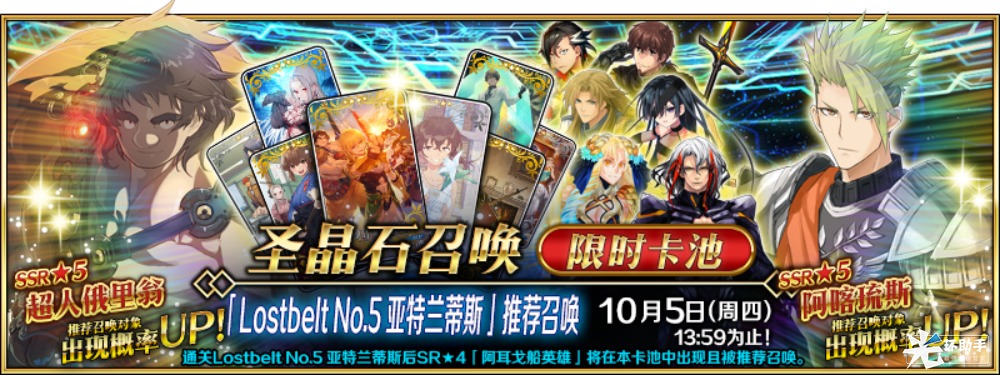 推荐召唤「Road to 7 [Lostbelt No.5 亚特兰蒂斯]」的相关从者中包含限定从者「★5(SSR)超人俄里翁」的8骑从者的3种卡池举办!