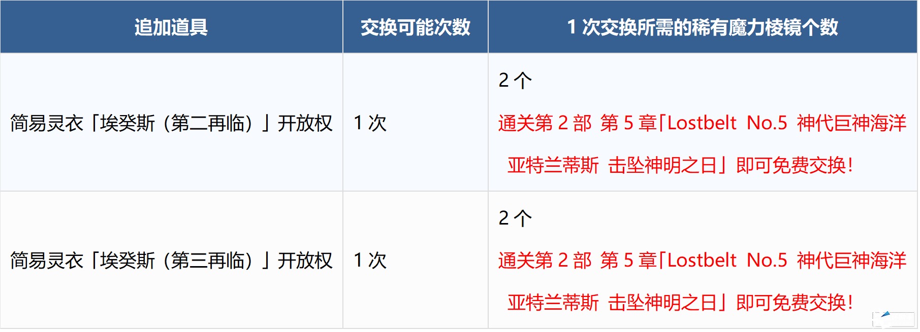 ※各使用2个稀有魔力棱镜交换简易灵衣「埃癸斯(第二再临)」和「埃癸斯(第三再临)」开放权后达成免费交换灵衣开放权的条件的情况下,将返还交换中使用的各2个稀有魔力棱镜至礼物盒。