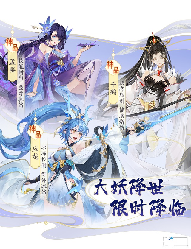 道友可通过活动内:限时玩法-降魔斩妖、兑换商店、特惠限时礼包,快速获得强力神品妖灵·应龙、千鹤、孟婆!