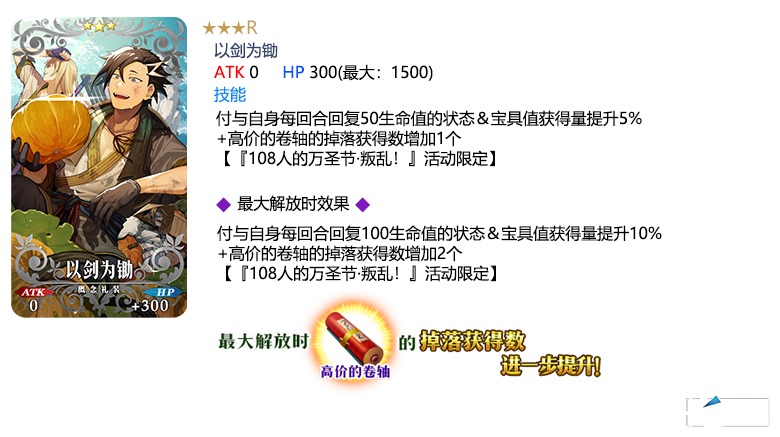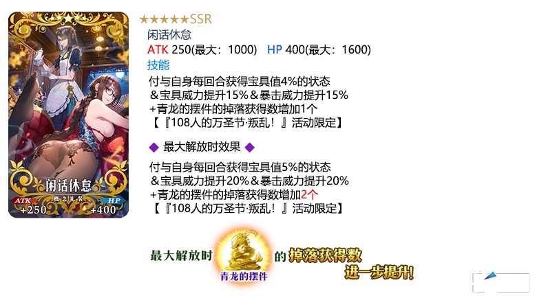 装备推荐召唤对象的3种限时概念礼装,在限时活动「108人的万圣节·叛乱!~小龙娘水浒演义~」中活动道具的掉落获得数将提升!