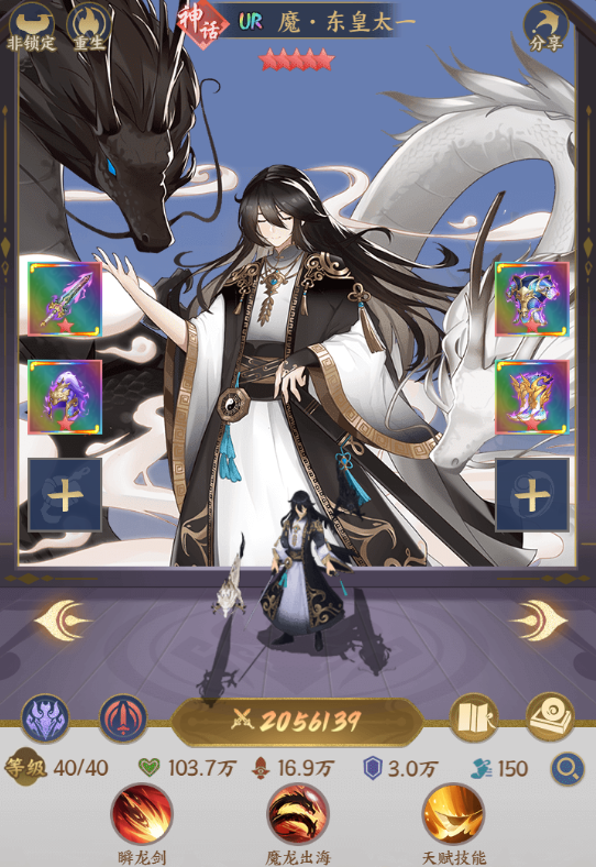 范围输出型战士,生命值越低输出越高,并且是范围输出,品级提升后,技能自带百分比回复已损血量,可以作为战坦肉的不行,输出还高,就算队伍仅剩东皇太一一个也有可能创造出奇迹,单挑通关,是最优质的前期推图幻神之一。