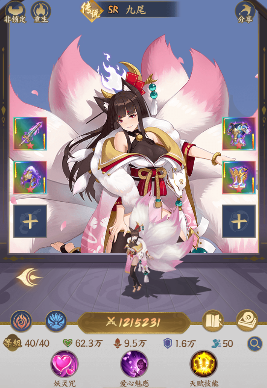 范围输出兼控制法师,游戏内特有的魅惑技能往往在战斗过程中会带来一定惊喜,品级提升后的魅惑概率提升,发挥好可以让敌方核心为己方打出成吨输出,或者控制住关键的敌方英雄。前期输出还算客观,即使到了游戏后期,遇到推图卡关的情况,建议换上九尾碰碰运气,属于万金油神将,抽到就建议培养,尽量不要当狗粮。