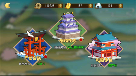 奇袭战:奇袭战是获取小兵进阶材料的重要途径。目前有三种,严岛合战、河越夜战、祗园争艳,可以获取大量小兵进阶材料。每个关卡都需要特殊的阵容,例如严岛合战是免疫物理攻击,只有法术攻击才能有效打击敌人;河越夜战是免疫法术攻击;袛园争艳是只能上阵女性武将。