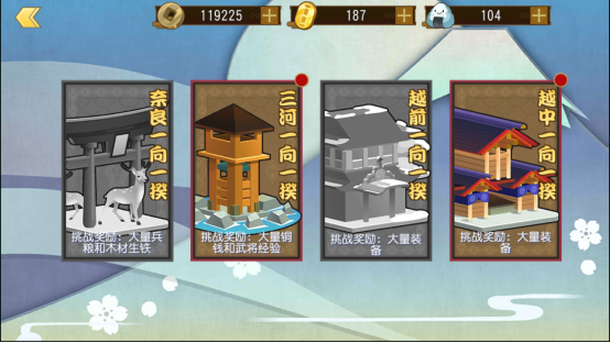 一向一揆:一向一揆是一个多资源产出的玩法。内含四个副本,奈良一向一揆、三河一向一揆、越前一向一揆、越中一向一揆,分别产出大量兵粮木材和生铁、大量铜钱和武将经验以及大量装备等,每天只会开启特定的副本。