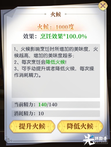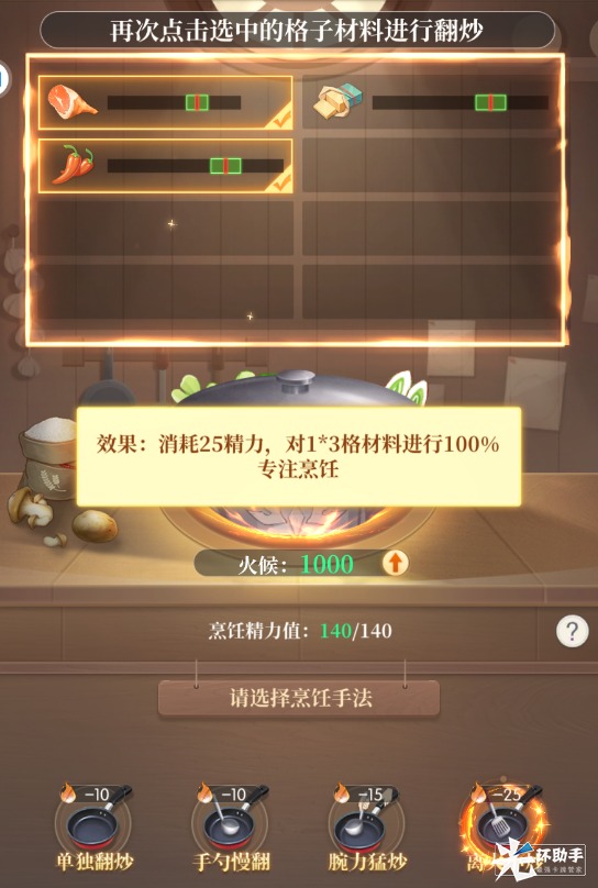 最后就是烹饪精力了,每次烹饪都会消耗一定的精力、同时我们调整火候也会消耗精力所以要赶在精力消耗完之前将每个食材烹饪好否则我们就没办法继续提升美味度或者更改火候了。烹饪不仅要考验对火候的把握,同时还考验合理地用烹饪手法减少精力消耗。