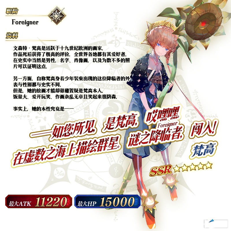 ※『「主线物语 虚数大海战 幻想急航 ~上浮吧鹦鹉螺号~」开放纪念活动』限时开放时间结束后,「★5(SSR)梵高」的「幕间物语」的开放条件变为通常的开放条件。