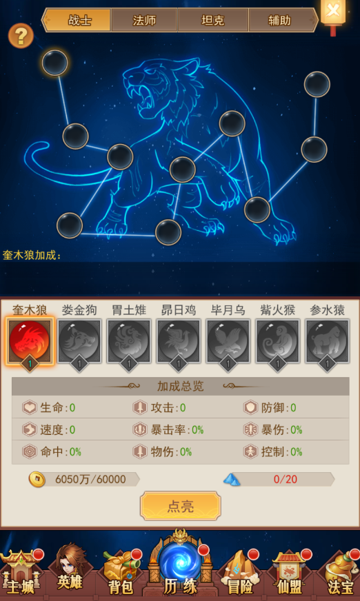 战士、法师、坦克、辅助4个职业对应着4张不同的星宿图,每一张星宿图只对应职业加成有帮助,而升级星宿图的材料是迷雾之尘,迷雾之尘需要击杀成功每一关卡后才能领取,从而用来升级星宿图。