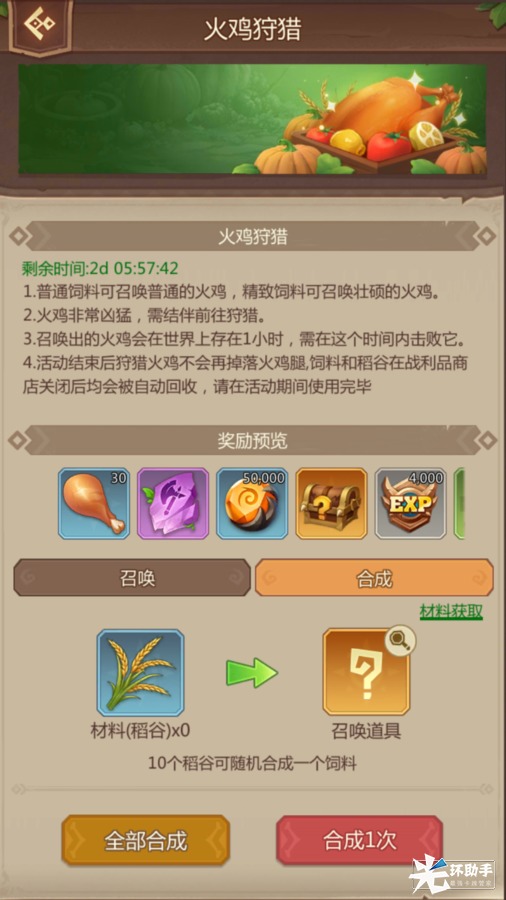 《侏罗纪军团》火鸡狩猎活动预告伊辛贝露发布于 2023-11-21一、活动时间2023.11.21 08:00-2023.11.23 07:59二、活动说明1.活动开始后,通过完成每日任务收集稻谷,每10个稻谷合成1个随机品质的饲料。2.使用饲料召唤出火鸡,召唤出的火鸡会在世界上存在1小时,需在这个时间内,和联盟成员进行集结进攻。3.活动结束后,狩猎火鸡不会再掉落火鸡腿,饲料和稻谷在战利品商店关闭后均会被自动回收,请在活动期间使用完毕。三、活动商店兑换商店关闭后,火鸡腿会被清空,同时每个火鸡腿转换成金币×10。