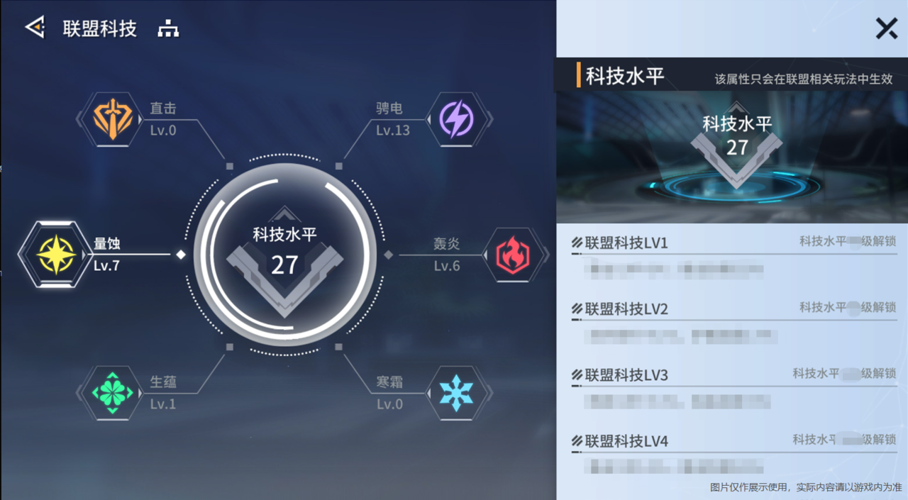 联盟科技系统拥有6种不同属性的核心科技,这些科技彼此独立却又相互关联,为链尉官们提供了更广阔的策略与技巧发挥空间。当这些科技的等级巧妙搭配,达到特定条件时,更可激活额外的属性数值,使全体战员获得优势。然而,请注意,这些属性数值仅在联盟相关的玩法中生效。