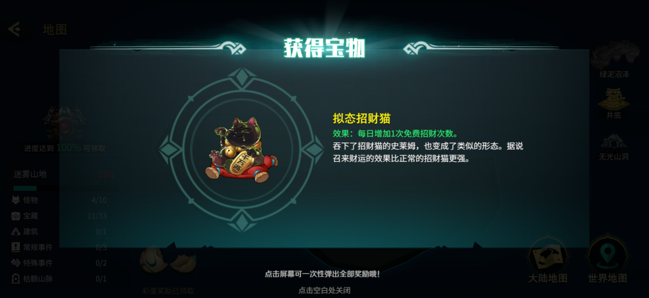 奖励:1金币=88888以太,10金币=666玛那,100金币=88神性,美食、饮料、甜点=50卡拉钻石,1000金币=88卡拉钻石+入口开启。进入井内获得宠物小软·哈尼,获得彩蛋奖励宝物拟态招财猫(效果:每日增加1次免费招财次数)。