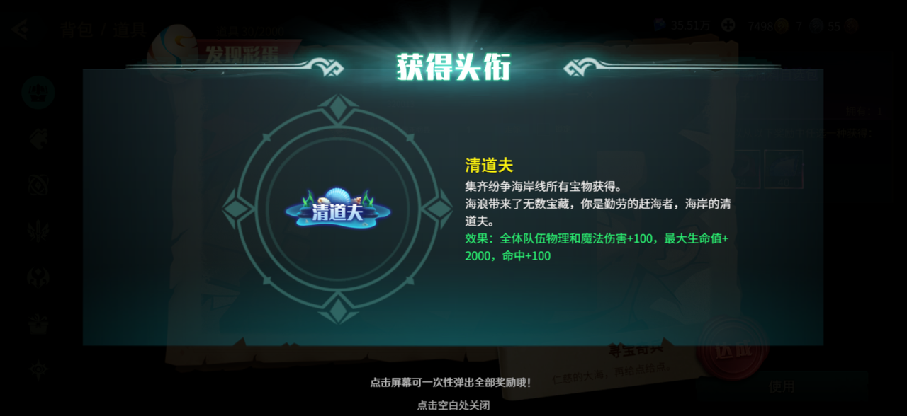 获得头衔清道夫(效果:全体队伍物理和魔法伤害+100,最大生命值+2000,命中+100)。