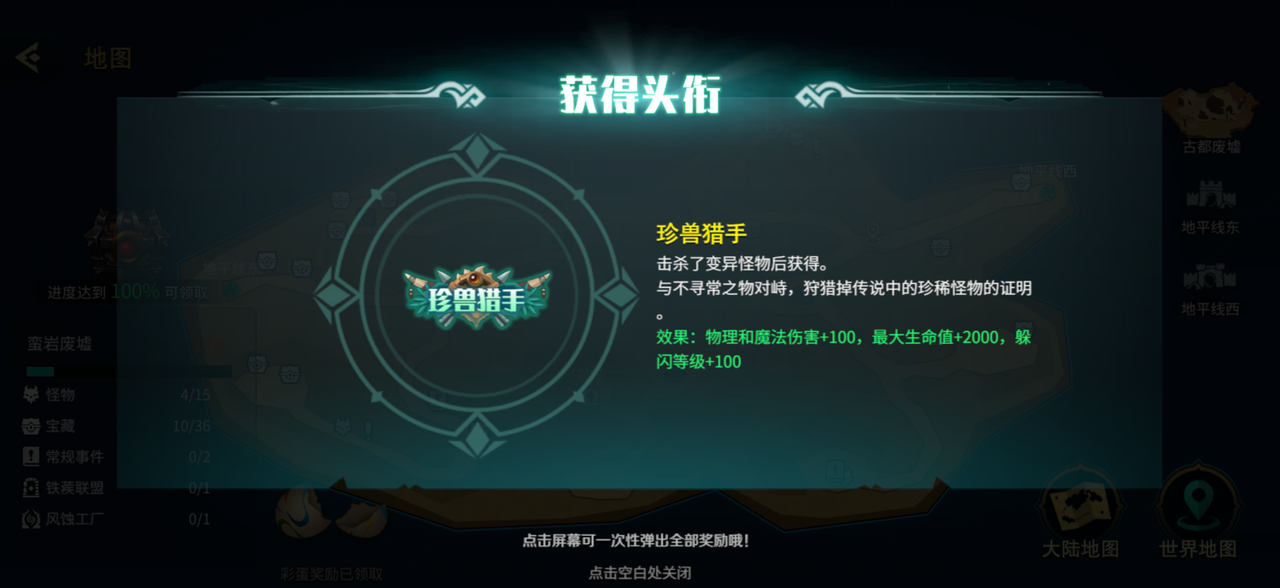 奖励:获得头衔珍兽猎手(效果:物理和魔法伤害+100,最大生命值+2000,躲闪等级+100)。