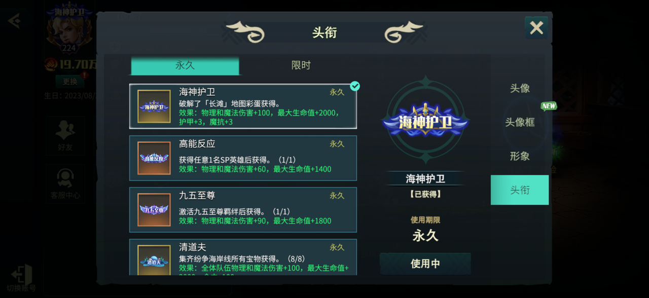 奖励:获得头衔海神护卫(效果:物理和魔法伤害+100,最大生命值+2000,护甲+3,魔抗+3)。