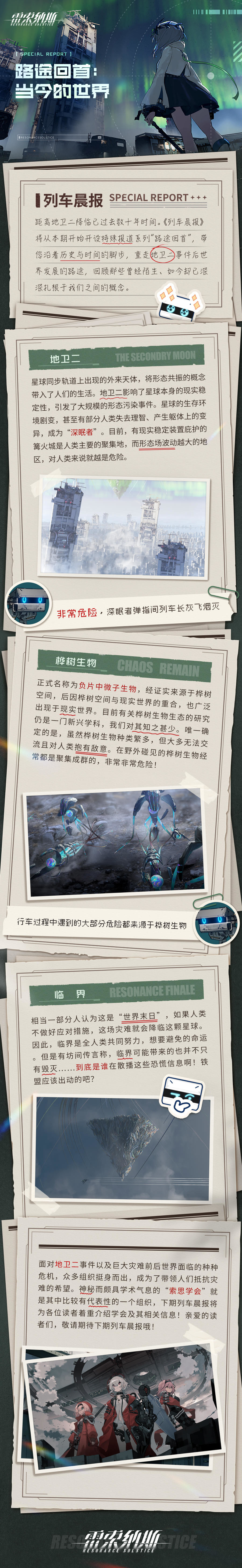 《雷索纳斯》【列车晨报】路途回首:当今的世界仿生波波会梦见列车长吗发布于 2023-12-21“列车长,这是新一期的列车晨报,似乎是围绕着‘地卫二事件’做了一系列专题……您感兴趣吗?”莉薇娅递来的报纸上,不知为何还贴了很多波克士的打印小纸条批注。总之,先读读看吧。