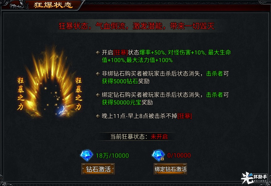 狂暴之力开启增加狂暴状态,提升的属性有:爆率+50%,对怪伤害10%,最大生命值+100%,最大法力值+100%;