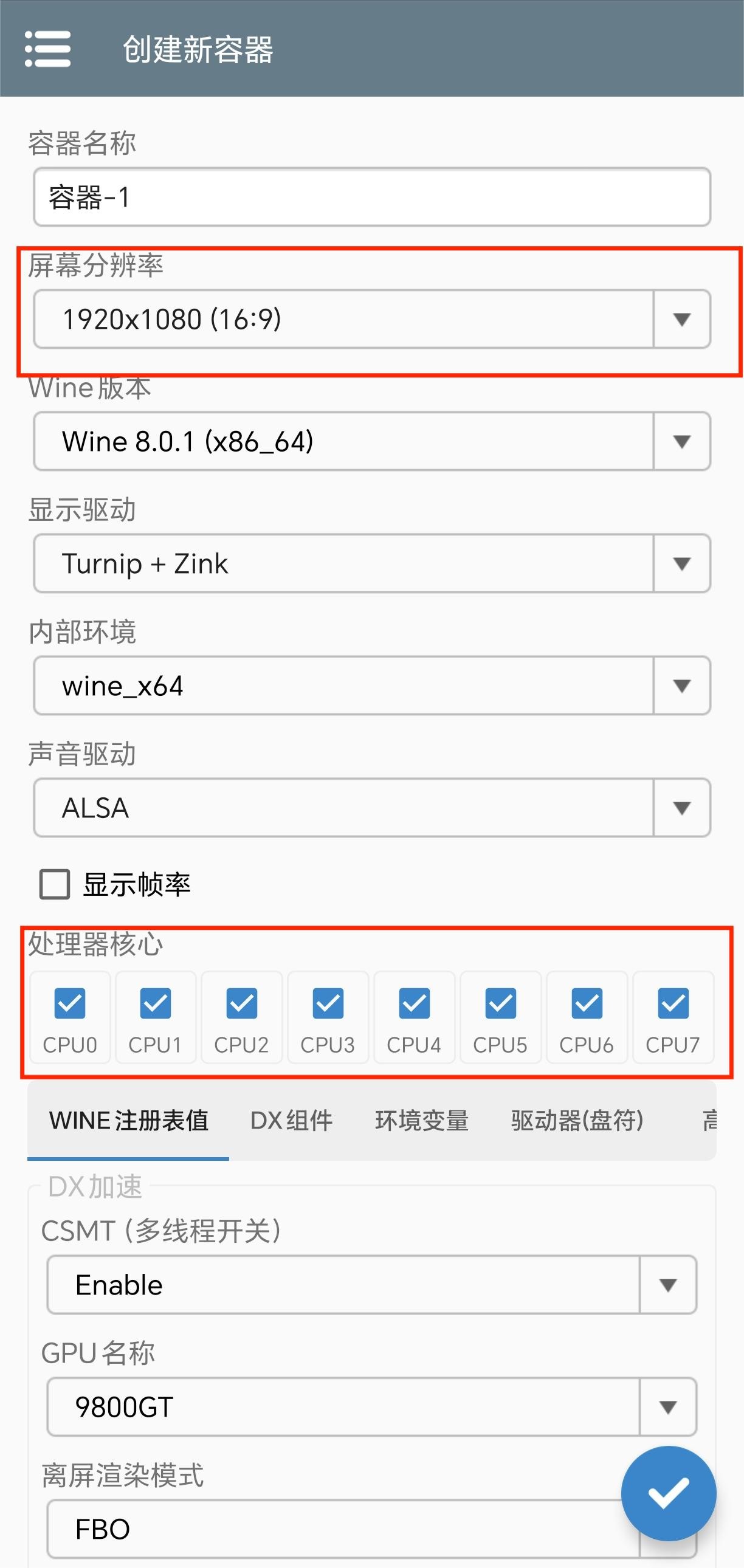 5、点击右上角“+”创建容器,修改分辨率并且把处理器核心全选择。