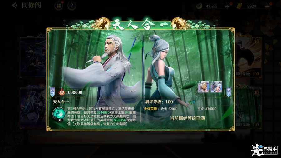 各位少侠好~【同修阁】的技能又上新啦!本次新增了超实用的融合技「天人合一」。该技能,融合了道家天人两宗的掌门人晓梦和逍遥子的毕生功力的技能,。该技能释放后可复活1名我本方阵亡的英雄,同时有概率解除我方所有英雄的控制效果。