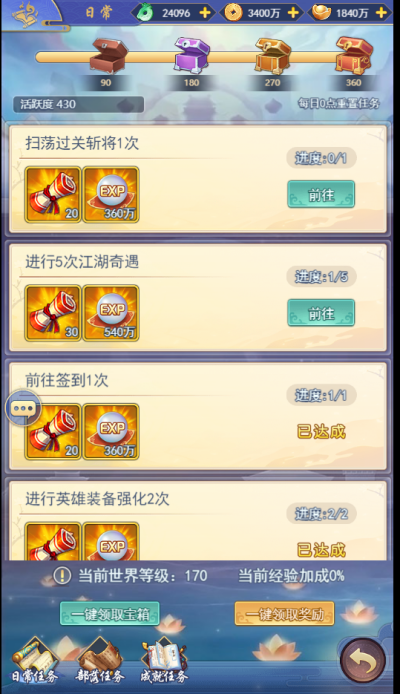 1、日常任务,主要经验来源,所有任务一定要完成,给的经验非常多,漏做一个都是吃亏