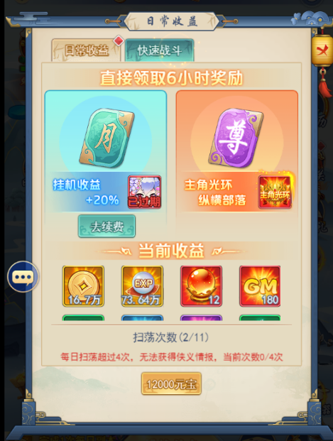 2、行侠仗义,每日次数记得一定要清完,包括元宝能购买的次数,一次都不能少