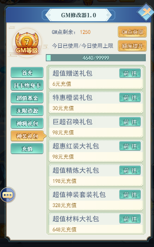 1、GM修改器,用于激活首充、月卡、终身卡、超值基金、无限资源、神将礼包、神装礼包、充值档位,需要消耗对应的GM点来激活,且同时激活线上活动,GM点可通过挂机,月卡,终身卡,特权,部落战、跨服部落战、迷失梦境、无尽试炼中获得,具体获取路径游戏内有对应的跳转按钮,小编就不一一阐述了
