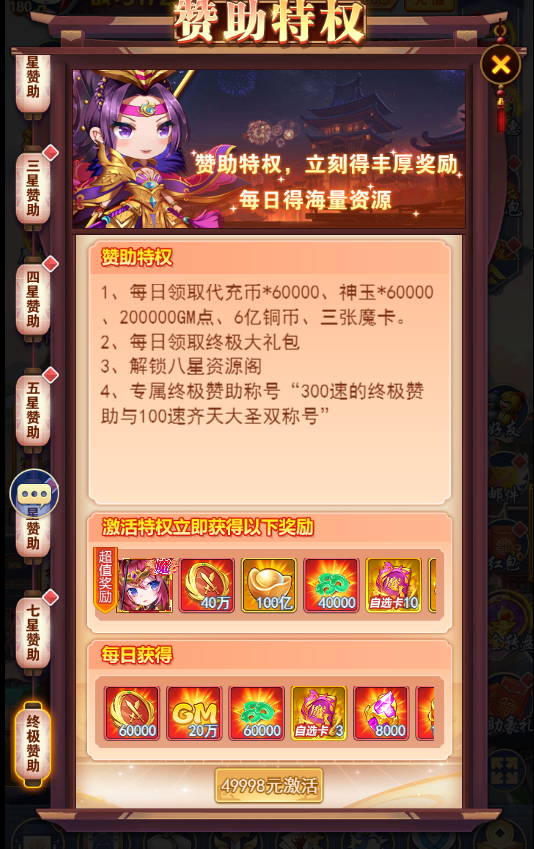 2、赞助特权:全游戏最牛逼地方,买完之后相当于每天白送100亿元宝,元宝消耗比例是1:10,更别说每天赠送的神玉、魔卡、HUR卡等等,用都用不完