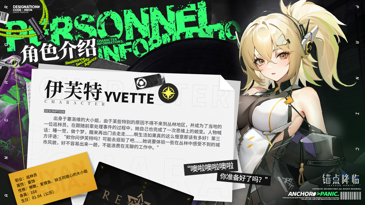 《锚点降临》档案解密 | 全新角色「伊芙特」即将登场元雅发布于 2024-02-18“欸你问伊芙特吗?可能去逛街了吧......她说要体验一些在丛林中感受不到的城市风貌,好不容易出来一趟,不能浪费在无聊的工作中。”《锚点降临》2月21日链接UP池轮替,全新角色“伊芙特”即将登场