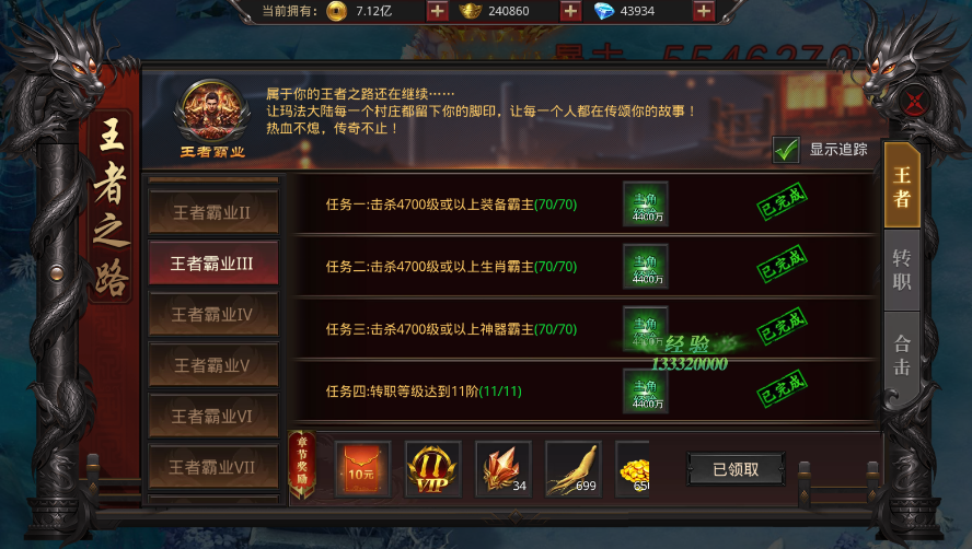 2、王者之路,打怪即可完成任务送真实充值红包,免费激活高阶VIP及VIP奖励:屠龙神甲,SSS英雄幻化,暗黑悟空;