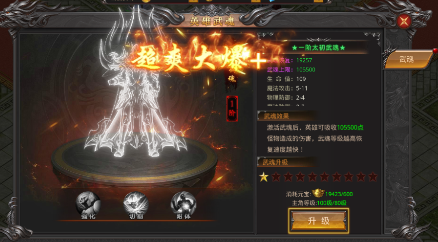 3、英雄武魂,元宝升级,增加英雄属性,提高挂机效率;