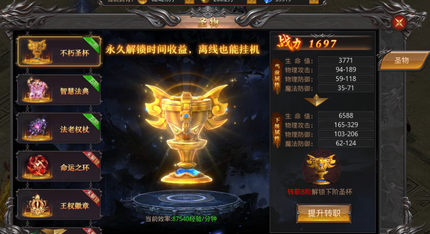 4、做任务即可激活圣物系统,离线也能挂机,各种超强属性,免费激活,免费升级;