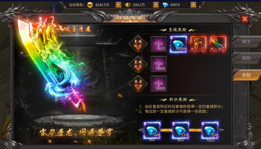 5、皇城争霸,城主专属七彩屠龙刀,绝版称号皇城霸主