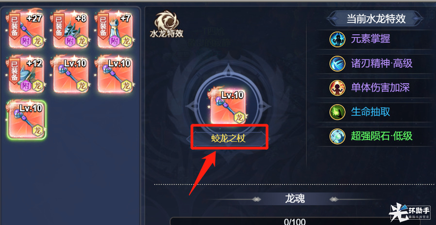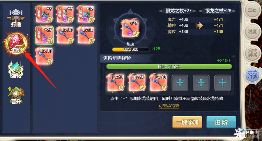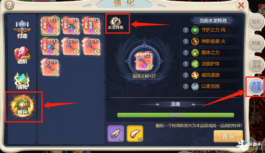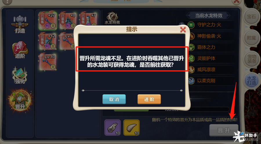 水龙装在第一次晋升后,之后的每一次晋升操作都需要龙魂数量达到满槽,否则不可晋升。龙魂可以在进阶时吃掉其他晋升后的水龙装时获得,也可以,在晋升后,放弃水龙特效晋升时获得。