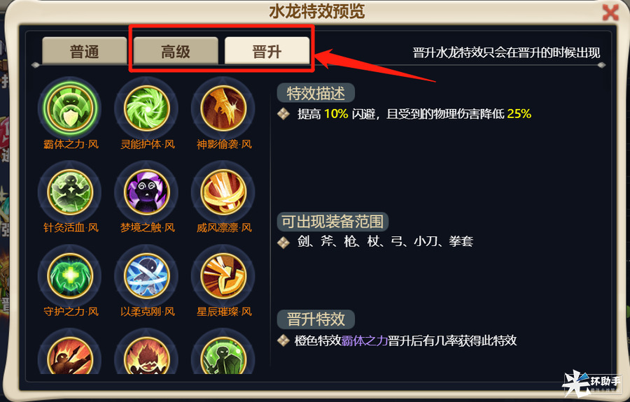 二、水龙装通过<晋升>操作,已有的橙色词条有一定概率晋升为高级水龙特效,会获得此特效对应的【随机】地、火、风词缀新特效。