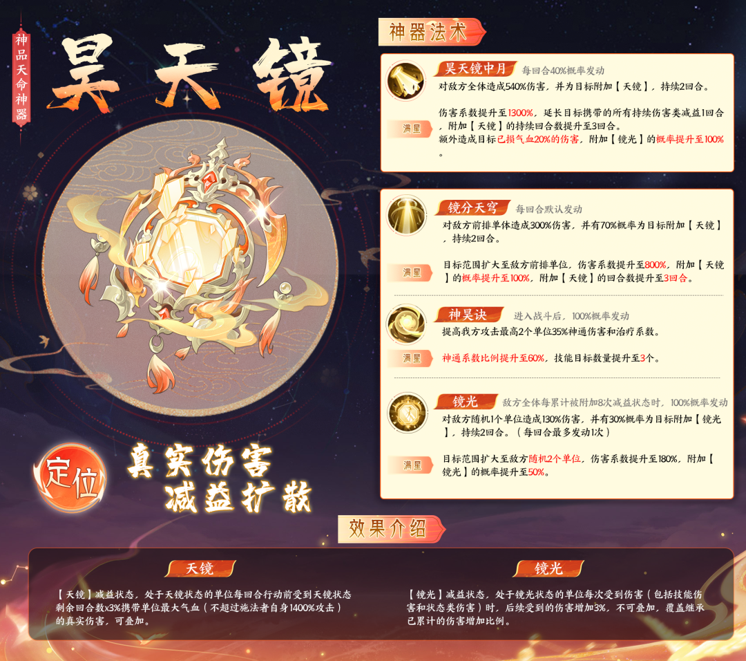 ●神通·昊天镜中月:对敌方全体造成540%伤害,并为目标附加【天镜】,持续2回合。