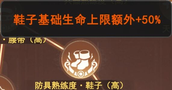 防具熟练度-鞋子(角色六级解锁):鞋子基础生命上限额外+50%,可以极大提高装备属性,为自身提供高额生命加成。