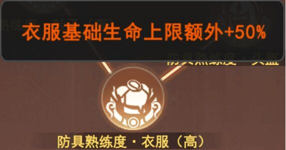防具熟练度-衣服(角色四级解锁):衣服基础生命上限额外+50%,可以极大提高装备属性,为自身提供高额生命加成。