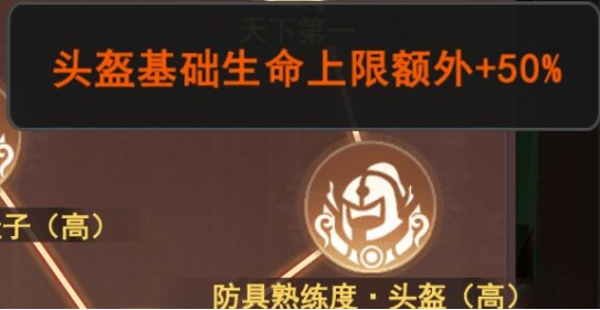 防具熟练度-头盔(角色二级解锁):头盔基础生命上限额外+50%,可以极大提高装备属性,为自身提供高额生命加成。