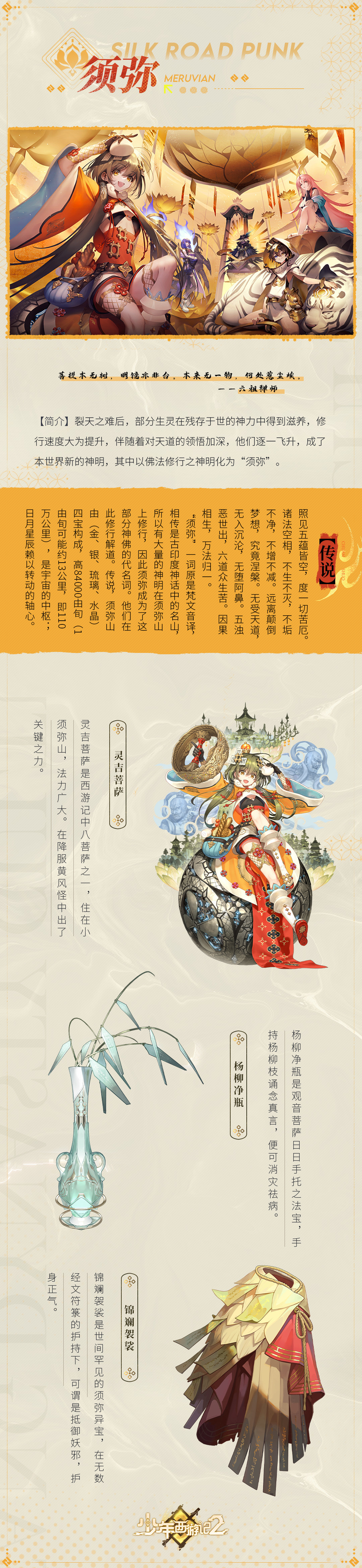 《少年西游记2》东土风物志·阵营篇丨须弥容容发布于 2024-04-13//裂天之难后,部分生灵在残存于世的神力中得到滋养,开智开慧,最终悟得天道,飞升成为世界神明。其中以佛法修行,尊崇平等慈悲,以救苦度难为使命的神明称作“须弥”。//六祖禅师曰:[菩提本无树,明镜亦非台,本来无一物,何处惹尘埃。]