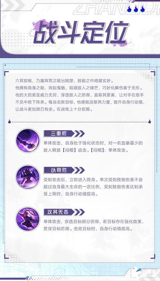 《西游:笔绘西行》出场角色|六耳猕猴伊辛贝露发布于 2024-04-24>>出场角色|“可分得清本王的真身!” >>出场角色|六耳猕猴 桀骜不驯的妖猴王,因孙悟空而生,却走上了与之截然不同的道路。 昔日少年,曾在方寸山菩提老祖膝下聆听教义,天赋异禀,才情出众。然不知缘何,与菩提老祖心生嫌隙,终至决裂。 离开方寸山后,复仇之心雄雄燃起,誓要挑战孙悟空。至此踏上了一条惊心动魄的复仇之路。 >>国创战斗动画 >>战斗定位